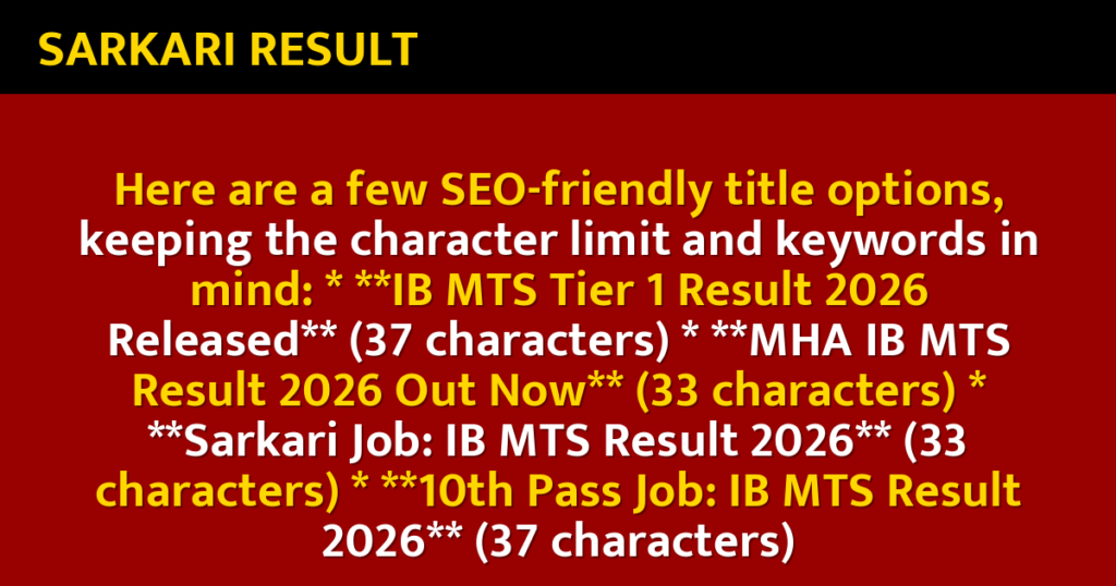 Here are a few SEO-friendly title options, keeping the character limit and keywords in mind: * **IB MTS Tier 1 Result 2026 Released** (37 characters) * **MHA IB MTS Result 2026 Out Now** (33 characters) * **Sarkari Job: IB MTS Result 2026** (33 characters) * **10th Pass Job: IB MTS Result 2026** (37 characters)
